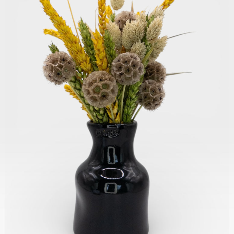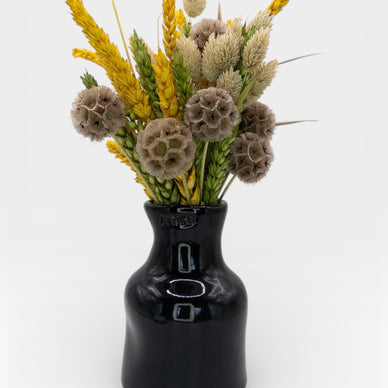 This handcrafted stoneware vase paired with a bouquet of dried flowers is slowly shaped by hand and finished in a deep black glaze with a subtle sheen, it adds a refined, contemporary presence to any space - bold yet balanced.Its organic, slightly irregular form makes each piece one of a kind, carrying the natural marks of the firing process.